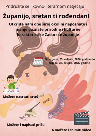 Pozivamo Vas na sudjelovanje u likovno-literarnom natječaju „Županijo, sretan ti rođendan!“ koji traje od srijede, 25. veljače do srijede, 25. ožujka, 2026. godine, a organizira se u povodu Dana Zadarske županije.