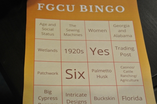 Studenti antropologije s Gulf Bay Sveučilišta obradili su patchwork tehniku ukrašavanja odjeće Seminola plemena približivši kroz projekciju njihovu kulturu odijevanja, promjene u odijevanju i prilagodbu suvremenim društvenim potrebama. Kroz BINGO igru, koja se odvijala u vrlo opuštenoj atmosferi učenici Škole za primijenjenu umjetnost i dizajn Zadar morali su odgovoriti na pitanja vezana uz projekciju. S patchwork tehnikom upoznali su se koristeći raznobojni papir umjesto tekstila. Iskoristili su ga i za oblačenje lutkica koje su u floridskoj sredini omiljeni suvenir.