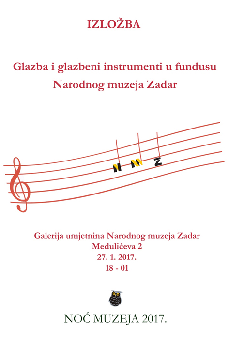 Tema: Izložbom Glazba i glazbeni instrumenti u fundusu Narodnog muzeja Zadar, muzej daje svoj doprinos ovogodišnjoj temi Noći muzeja, a to je Glazba i glazbeni velikani i njihov utjecaj na društvo. Tom temom organizator Hrvatsko muzejsko društvo želi ukazati na važnost prezentiranja i popularizacije glazbene baštine i njene muzealizacije.